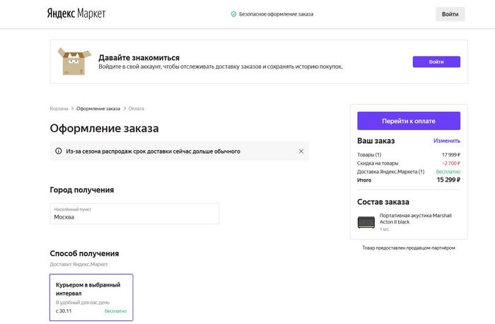 Купил я в подарок колонку Marshall Acton II black на яндекс.маркет (не реклама). Понравилась она мне, плюс скидки. Действительно по цене вышло лучшее предложение из тех, что я нашел. Заказывал со своего аккаунта. У меня на нем подключен плюс.