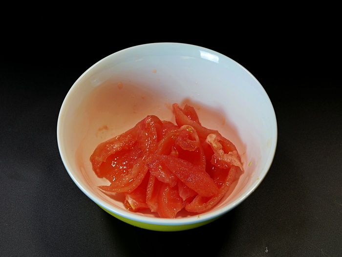 Пока овощи томились, очистил от шкуры и семян пару помидоров. Вот таких, очищенных, нужно 100 граммов.