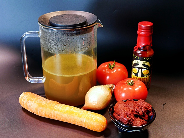 В кадре: крепкий говяжий бульон, морковь, лук, помидоры, томатная паста, острый соус. За кадром соль, сахар, душистый перец, рисовый уксус.