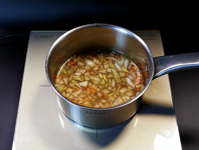 Мелко нарезали по 50 граммов лука и моркови, залил 250 граммами бульона, довёл до кипения и томил овощи на медленном огне 15 минут, пока морковь не стала мягкой.