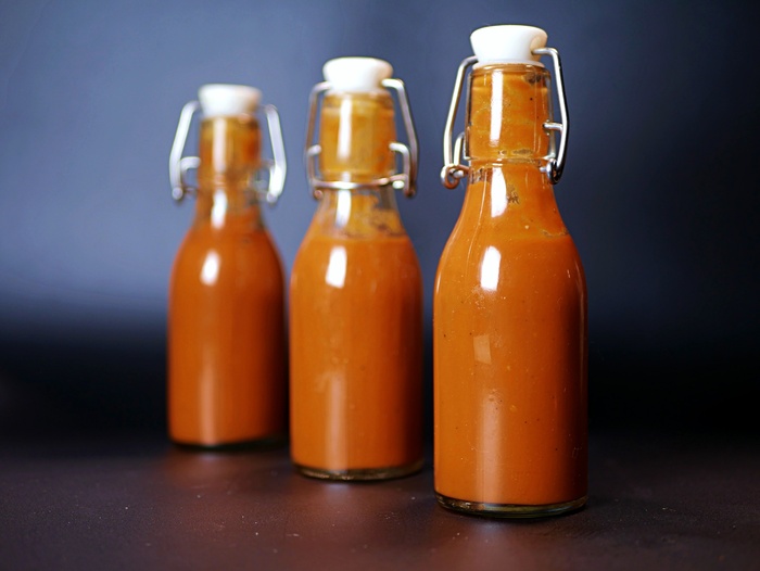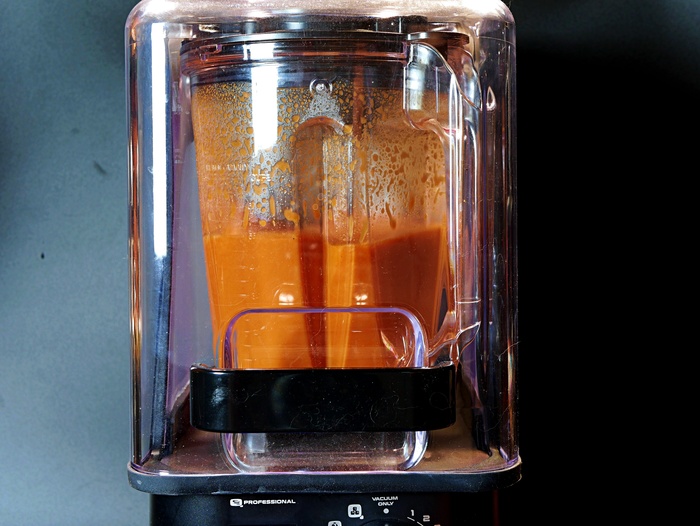 Потом отправил всё (овощи в бульоне, помидоры, молотый перец) в блендер, прибавил 100 граммов томатной пасты, 150 граммов рисового уксуса и 0,3 чайной ложки острого соуса. Так мало, потому острил вот этой вот падлой, состоящей из микса рипера и скорпиона и, кажется, всё равно получилось острее, чем нужно. А так, думаю, 10 граммов свежего острого чили будет вполне достаточно.