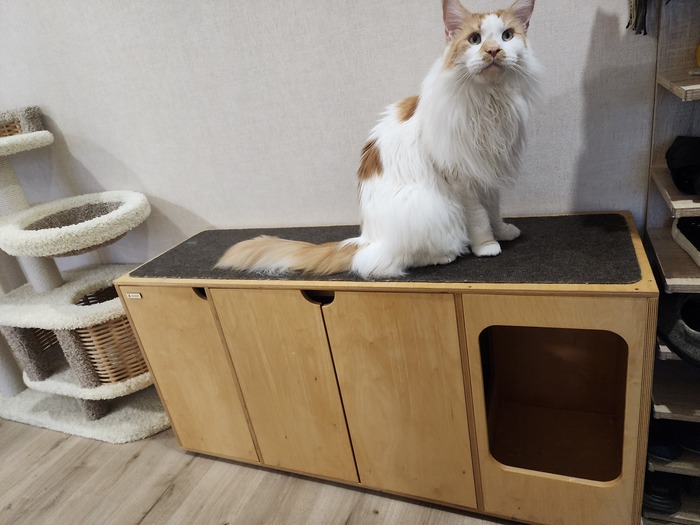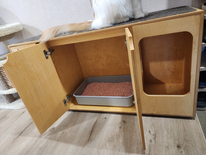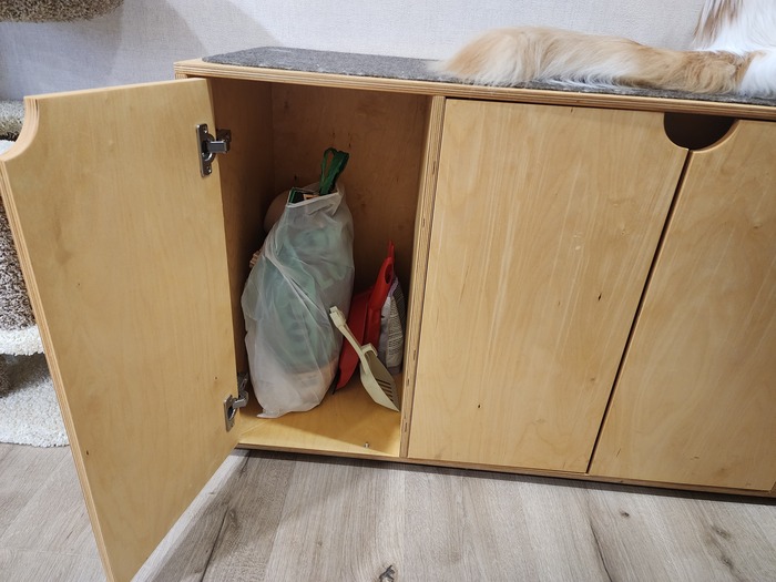 Но сам по себе лоток, даже закрытый, казался нам не самым удачным решением, потому что к прихожей примыкает наша спальня и кухня, нужно было решать вопрос с разбросанным наполнителем и запахом.
