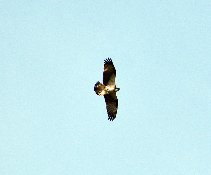5. Скопа. Красная книга РФ - вид, находящийся на грани исчезновения. Скопу я видел всего лишь один раз. Причем случилось это не на берегу Рыбхоза или реки, а на окраине леса, почти у жилых домов. Понятия не имел, кого фотографирую, но сила интернета подсказала, что это скопа. Уже потом, когда внимательней рассмотрел фотографии, обнаружил, что летела птица не с пустыми лапами, а с рыбой.