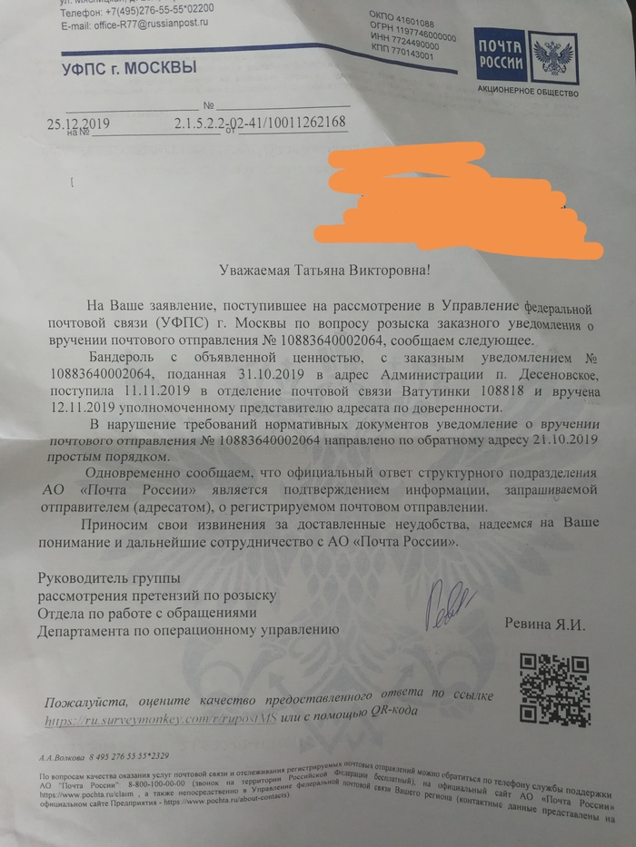 А вот второе и третье. Дабы не загружать вас чтением бумажек, прикладываю одну. Во второй копипаста с другим номером отделения. Суть обоих ответов: плохие сотрудники отправили оплаченные заказные уведомления как простые, сотрудникам сделали атата, извините пожалуйста, считайте эти ответы подтверждением получения бандеролей.
