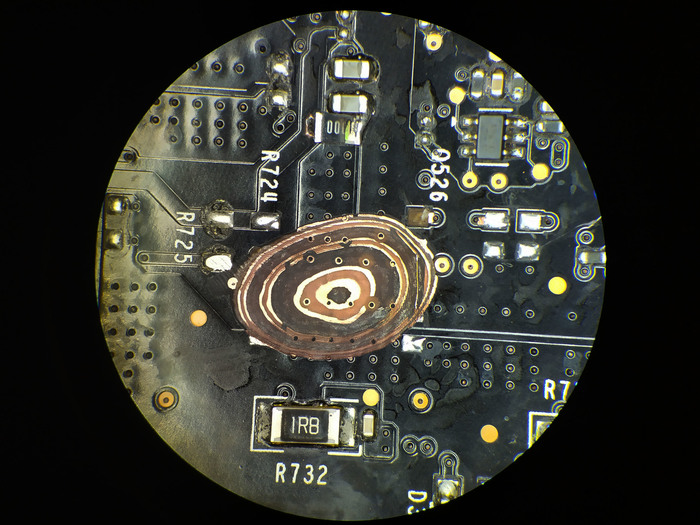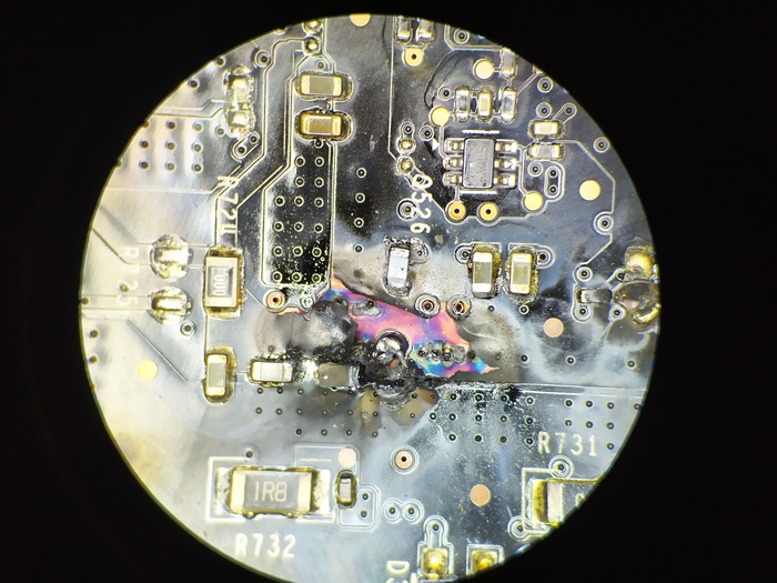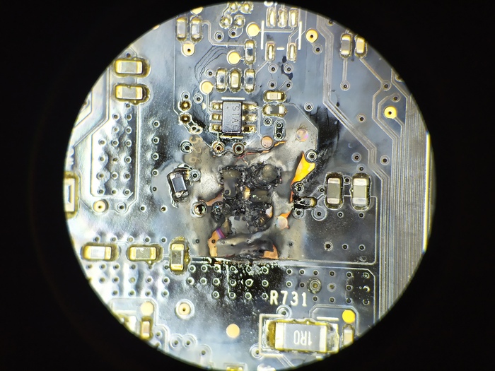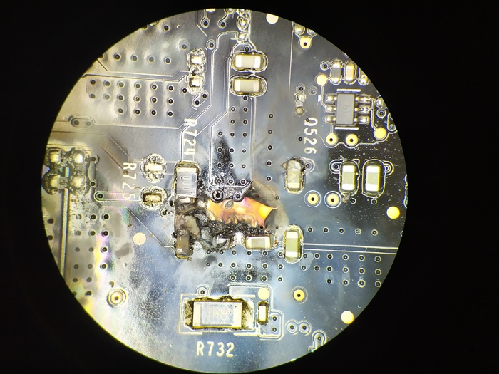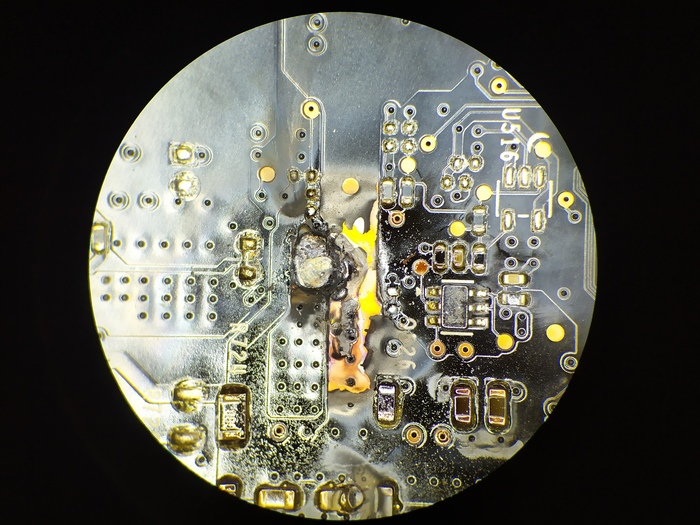 А подгорел потому, что ШИМу, видимо, досталось после взрыва на плате и по входу стало низкое сопротивление.