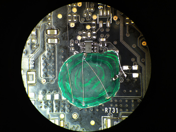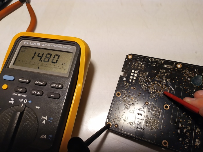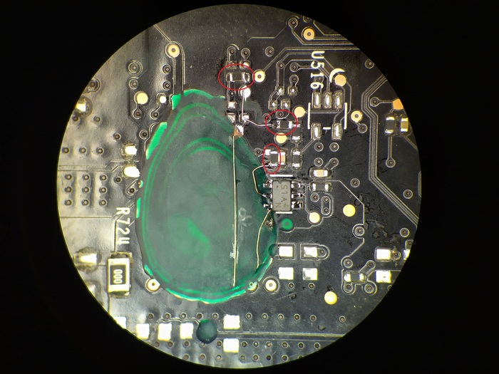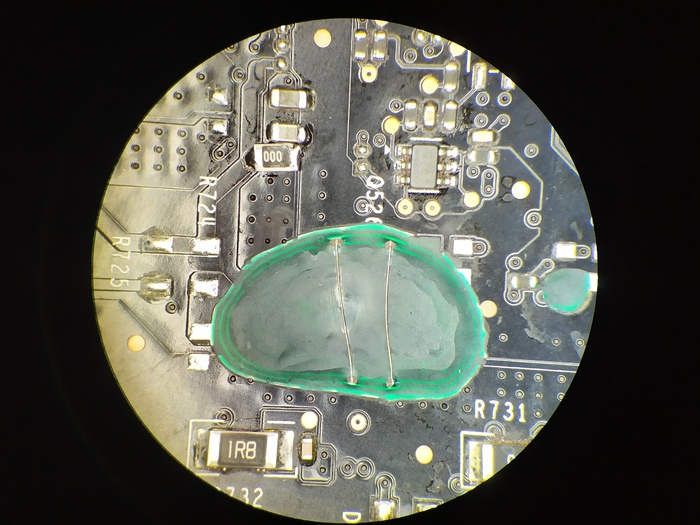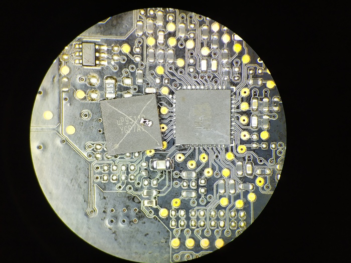 Восстанавливаем и это, используя немножко навесного монтажа. Половина 6ти ногой козявки висит почти в воздухе и к её половине подтянуты необходимые перемычки. А чуть выше 6ти ногой козявки пришлось переставлять резюки на другие места с небольшой переделкой, но чтобы подключено всё осталось на свои места. Получилось вот так.