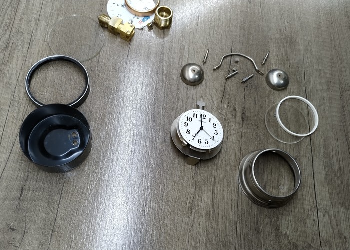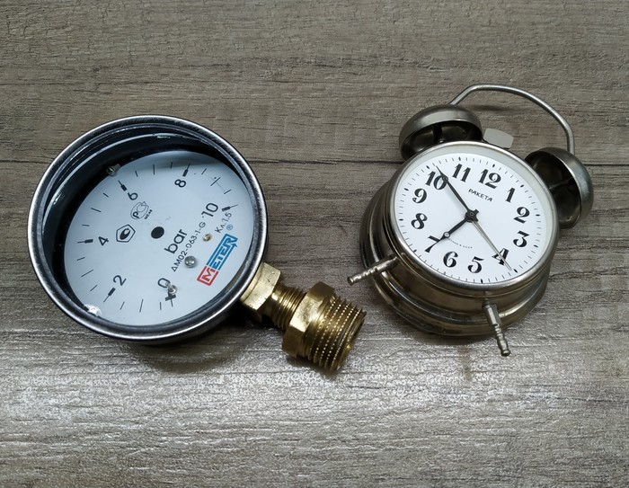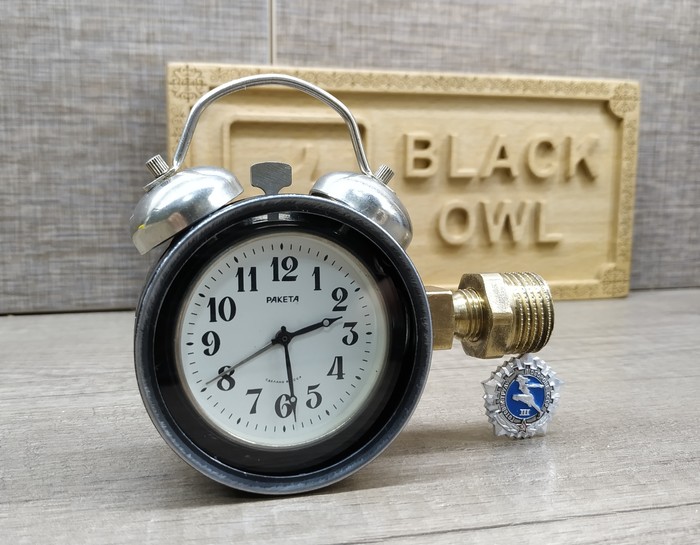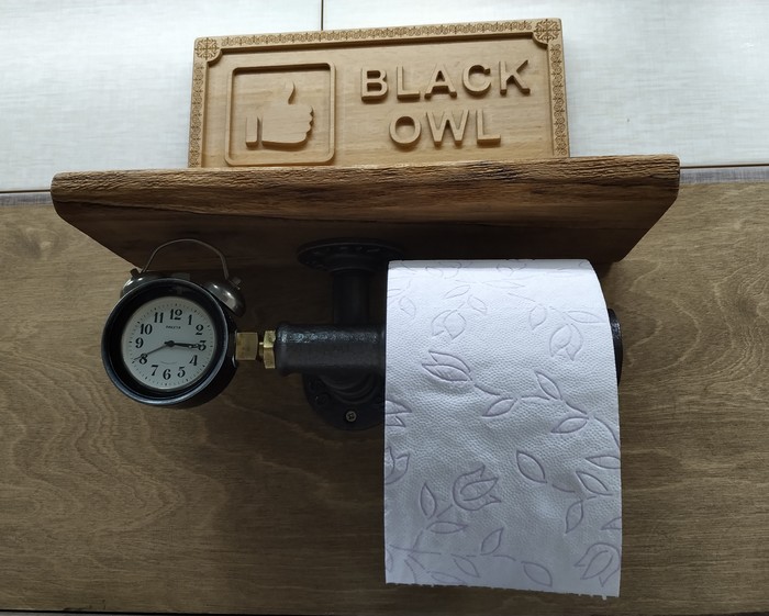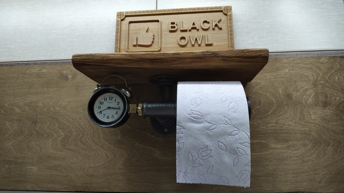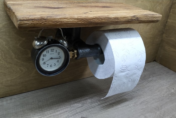 Из материалов, обрезки, тройники старых труб, деревяшка от палеты очень красивая попалась. Будильник механический СССР. Краска молотковая. Крепления к стене с алиэкспресс. Но в итоге себе сделал поменьше, последние фотографии.