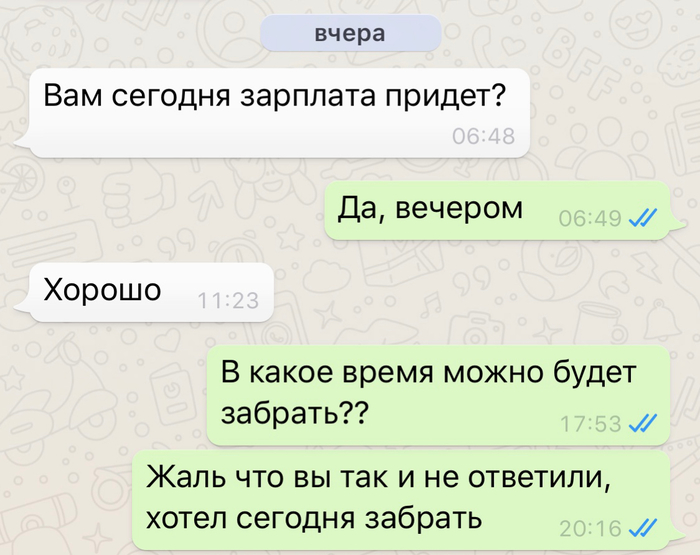 Вроде договорились и я был в ожидании вторника. В понедельник в 7 утра вдруг решили уточнить что придёт ли мне сегодня зп, странно конечно ну да ладно. Зп пришла чуть раньше чем ожидалось и я был готов забрать в понедельник, но получил игнор. Ничего страшного, договорились же на вторник