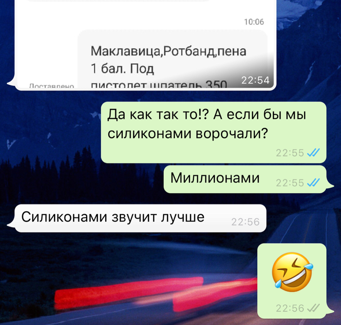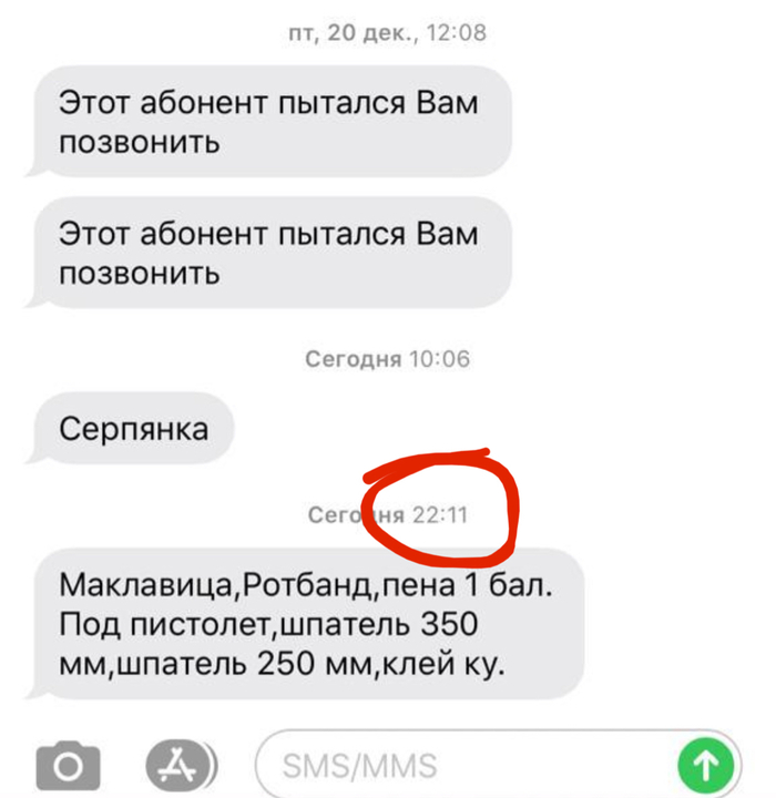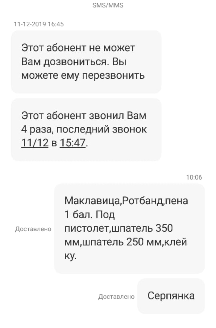 Один день снабженца. С объекта приходит смс «Серпянка»,купил, привёз за 50 км. Вопрос работника: «Где остальное!?» показывает смс