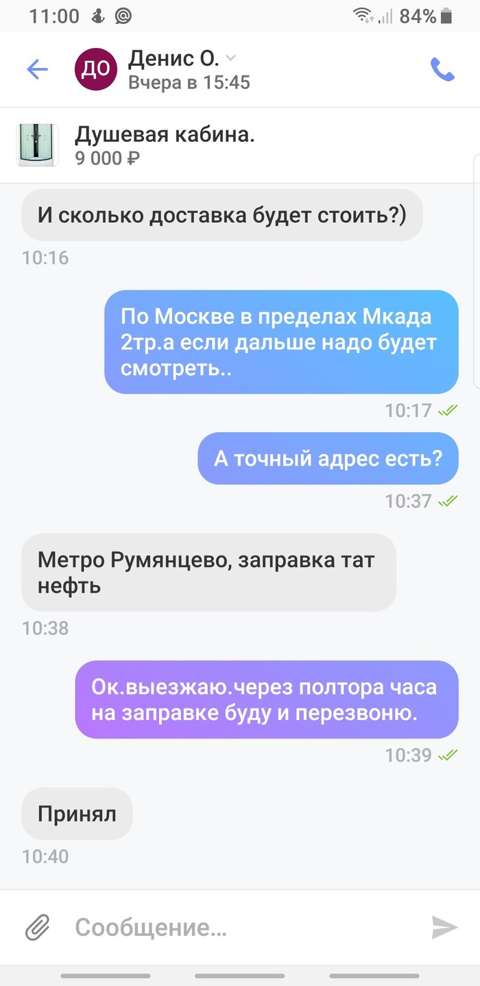 Здравствуйте сообщество Пикабушников)Не думал никогда что придется обращаться к силе Пикабу.Но к черту предисловия,сейчас сама история.Мы занимаемся продажей и доставкой разных фабричных китайских товаров.Но на данный момент душевых кабин.Обьявления висят на Авито и Юле.И вот вчера вечером позвонил мне по телефону некий Денис.О и хочет заказать недорогую душевую кабину.Причем рассказывает между делом что у них своя бригада и они занимаются ремонтами...И в дальнейшем могут брать кабины партиями по 5-10шт.Обговорили цену ,она есть в обявлении,и сумму доставки.Договорились что он напишет свой телефон в обьявлении и куда доставить кабину.Утром он написал поздоровался.Я ответил что все загрузил.Он уточнил еще раз по сумме доставке и куда везти кабину.Ну и самое главное, интересное в этой истории что после доставки до заправки Татнефть и звонка как договорились Денис.О сначала просил подождать так как едет в пробке.А потом где то через час позвонил и сказал что ничего брать не будет так как нашел дешевле такую же.На вопоос подъехать посмотреть сказал времени нет и смотреть не будет.И на предложение оплатить хотя бы доставку обещал до вечера перевести 500р так как дороже платить он смысла не видит!Ну ок.в 9 вечера звоню этому Денису.О и опять сюрприз:извините денег у меня нет на карточке ,как будут переведу и бла бла бла...Морали не будет...Гнилые люди встречаются в жизни...Пусть Вам они не встретятся...
