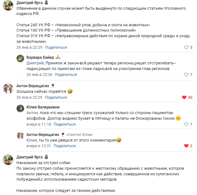 Инцидент возмутил общественность. "Собаки находились в ветеринарном блоке и проходили лечение перед тем, как их заберут домой. То есть они не были бесхозными, — отмечает юрист Сергей Егоров, представляющий интересы зоозащитников в суде. — Кроме того, их нельзя умерщвлять на территории приюта, это противоречит федеральному закону об ответственном обращении с животными".