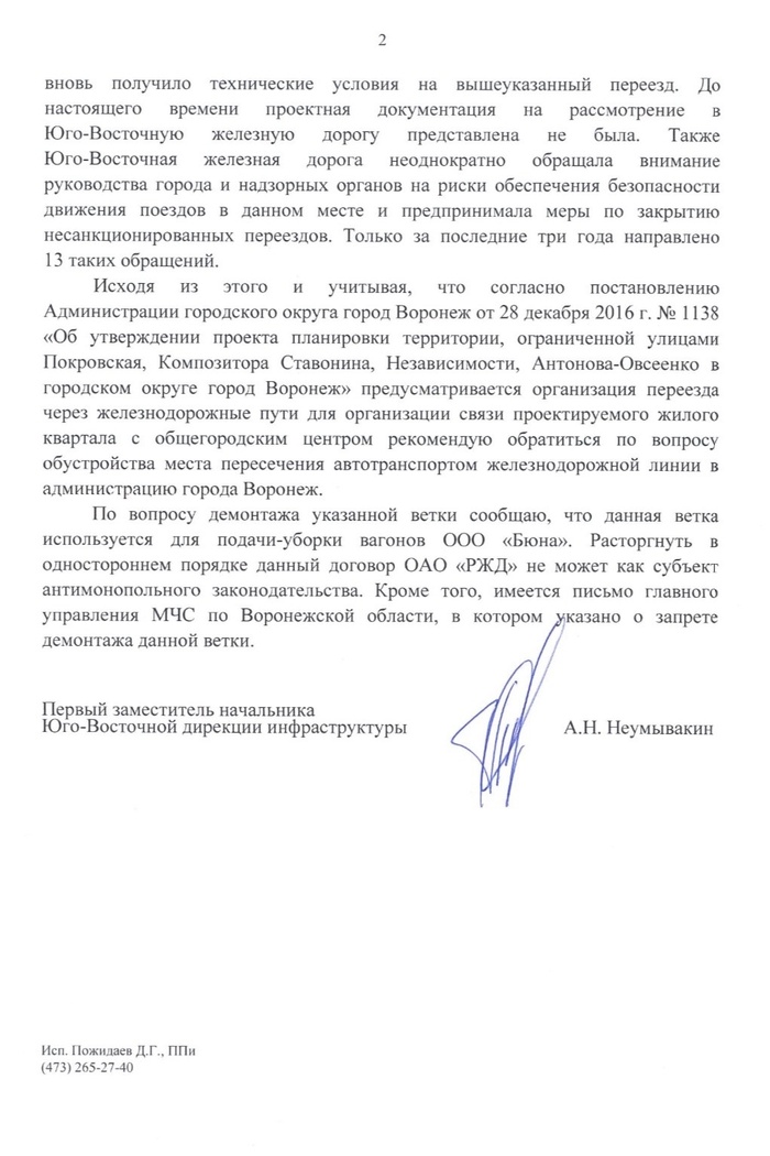 Позиция РЖД очевидна: мы не будем строить там переезд, так как этим должен заниматься город. Позиция города - мы не можем заниматься переездом, так как это территория РЖД. При этом администрация города почему-то ждет, что железнодорожную ветку выведут из эксплуатации, несмотря на то, что из официального письма РЖД следует, что железнодорожное полотно не ликвидируют.