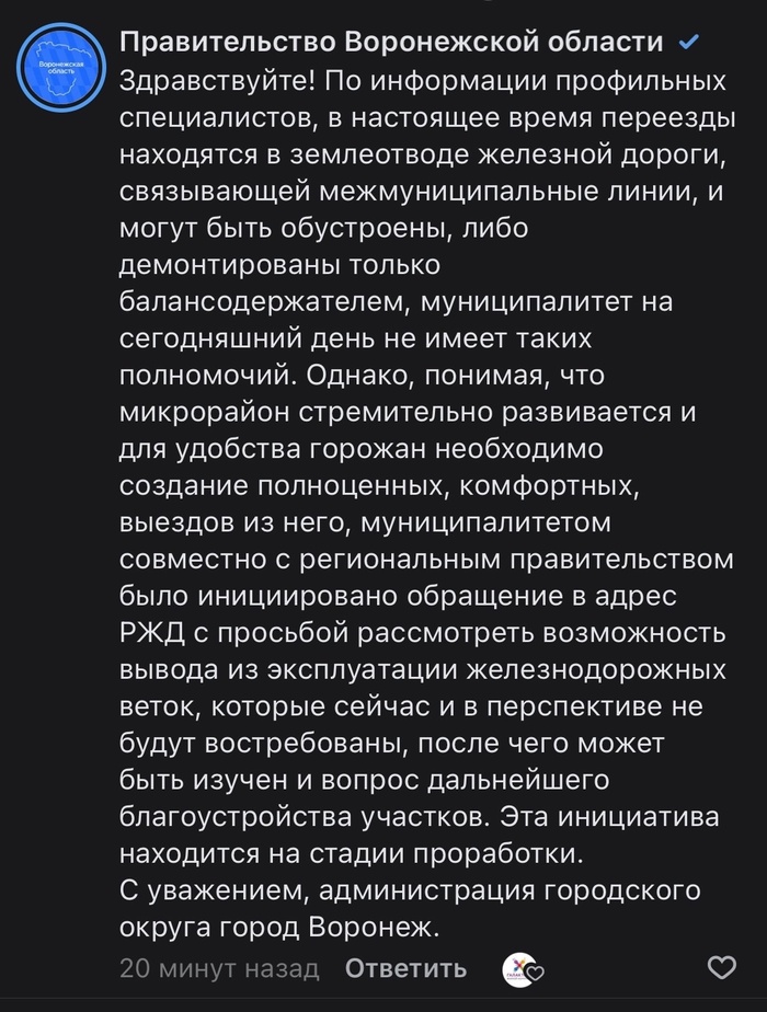 В комментариях под видео официальный аккаунт Правительства Воронежской области ответил так: