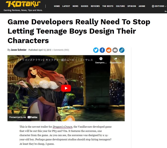Естественно, мангака не сам выдумал приятные округлости у героинь – они изначально нарисованы самим Камитани, да ещё и анимированы специалистами из Vanillaware. Всю это прелесть показали в японском трейлере Dragon's Crown. Точнее, в нескольких трейлерах, посвящённых каждому играбельному персонажу. Но нас интересует трейлер, посвящённый персонажу Sorceress. Трейлер попался на глаза журналисту издания Kotaku - Джейсону Шрайеру. Шрайера трейлер возмутил до глубины души, и он выпустил для Kotaku материал из одного абзаца с заголовком «Разработчики должны перестать позволять подросткам создавать своих персонажей», и весь текст сводился к тому, что волшебница, по мнению Шрайера, разработана 14-летним подростком, которых нанимают из-за дешевизны труда.