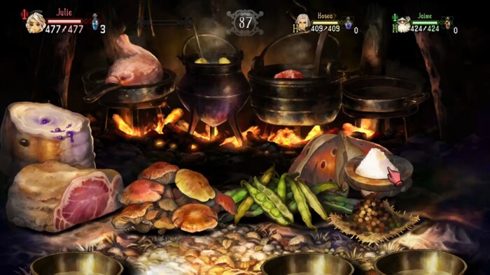 Во время похода будут перерывы на покушать. На этот раз Vanillaware не сделали магазинчика с едой, но на привале можно приготовить самому себе еды из убитых врагов, причём даже боссов. Процесс достаточно простой: кидаем еду на сковороду или в кастрюлю, закидываем приправами и при желании помешиваем. Чем больше приготовили и съели за отведённое на привал время – тем сильнее станете в следующем уровне, но потом бафф исчезнет.