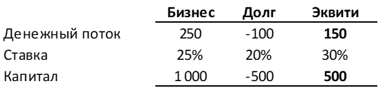 В нашем случае стоимость кофейни остается равной 1000, долг и эквити должны остаться по 500, но при этом мы должны найти такую ставку доходности, которая обеспечит это равенство. Эта ставка равна 30%.