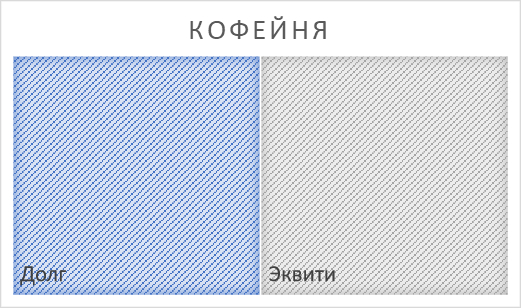 Представим теперь, что у вас есть только 500, но вы очень хотели бы купить кофейню, поэтому вы берете еще кредит на 500 под 20% годовых. Пару слов про долг. Самый стабильный компонент капитала – долг. Сложностей с его оценкой, как правило, не возникает, поскольку платежи зафиксированы, риски сведены к минимуму и сгружены на владельцев эквити, а ставка определяется Центральным банком и практически идеальной банковской конкуренцией. Поэтому оценка долга практически не меняется (для упрощения примем так, хотя на самом деле и оценка долга меняется, но про это в другой раз). Банк предложил вам сразу оформить кредит на кофейню. В итоге вы получаете в собственность кофейню, продавец получает за нее 1 000, а вы заплатите 500 из собственных средств и 500 из заемных.