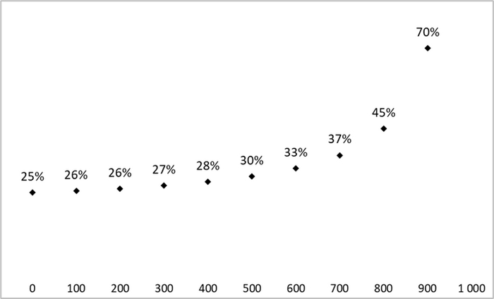 Получается, что владельцы эквити должны получить 30%, вместо первоначальных 25%. Эта разница в 5% - представляет собой компенсацию за дополнительные риски банкротства из-за наличия долга или риск финансового рычага. Как говорится сыр бывает только в мышеловке. Несмотря на то, что вы получаете большую доходность на свои вложенные 500, за это вы берете на себя повышенные риски того, что банк может забрать вашу кофейню за долги. Давайте посмотрим, как меняется ставка эквити в зависимости от размера долга.