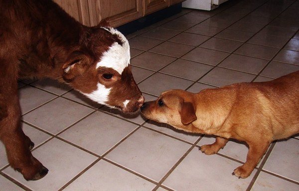 Телочка по кличке Мунпай (Moonpie -"Лунный пирожок") из породы низкорослых коров. Последние 6 недель она живет на ферме Rocky Ridge Refuge для спасенных животных в Арканзасе. Мунпай довольно необычная корова, так как самыми близкими ее друзьями на ферме стали 12 собак.