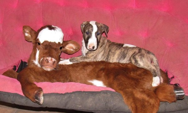Удивительно, что больше всего телочка подружилась с белым бультерьером по кличке Спакли. Спакли глухая собака и очень добрая. Она любит общаться с детьми и сразу же повела себя дружелюбно по отношению к Мунпай. Теперь она почти не отходит от телочки, вылизывает ее и они даже спят вместе.