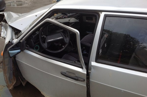 В общем по инерции я вскользь уткнувшись в батю, "соскальзываю" и лечу головой прямиком в торпедо... Наверное больно, но я пока не в курсе. Тут вроде бы и остановиться. Но, как оказалось, инерция штука лютая и контролю, в такой ситуации, поддается едва ли...Короче моя голова и тушка продолжили путешествие по салону, попутно собирая на себя "травмобезопасный" пластик. Следующим препятствием, после торпедо, стал руль. Короче головой я и его отломал. В общем суть да дело, пошли скриншоты и вот я сижу под деревом и у меня хлещет кровище из головы, как в Питергофе вода из пасти льва. Далее скорая, звонок жене, находившейся на 9-м месяце, что мол машина немного сломалась и домой приду поздно. Как видно на фото, сторона пассажира не деформирована сильно, то есть я максимум бы повис на ремне, ну может батю бы боднул)) А так почти весь крит.дамаж я причинил своей тушкой. Хорошо, что моя голова оказалась крепче, чем салон ВАЗ 2109 )))
