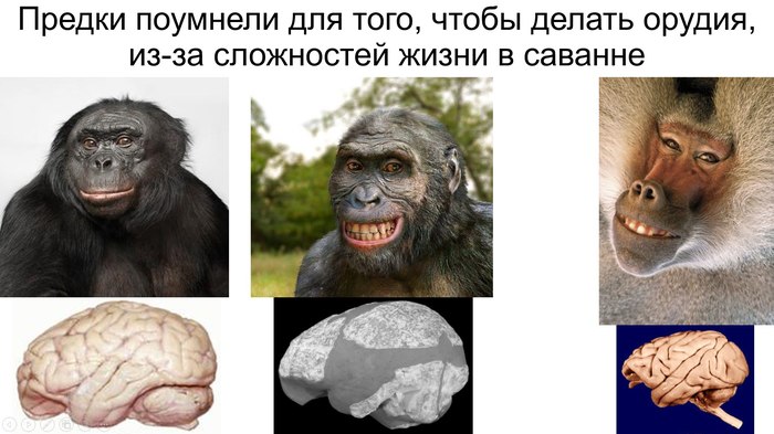 Другое распространённое мнение о наших предках и о том, зачем развивались мозги, состоит в том, что большой мозг нашим предкам был нужен для того, чтобы делать орудия труда, потому что им очень нелегко жилось в открытой саванне со множеством опасностей, множеством сложностей и там было так плохо, что надо было быть умным.