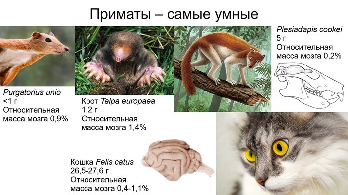 Поэтому, мы видим, что, например, у пургаториуса (который жил 65 млн.лет назад и был первым, не совсем даже ещё приматом, а «приматоморфом») мозг весил, скорее всего, меньше одного грамма. Честно говоря, точно мы не знаем, потому что мозговой коробки не найдено. Однако у нас есть челюсти, и уже по размеру челюстей понятно, что мозгу разгуляться было негде. Получается, что относительная масса мозга 0,9% . А вот у крота, который по масштабу тела примерно сопоставим с пургаториусом, то есть масса тела примерно та же самая... Так вот, современный европейский крот имеет массу мозга больше 1 грамма и относительно массы тела практически 1,5%. Получается, что наш великий, могучий и на тот момент, вроде бы, супер-интеллектуальный предок — пургаториус — был глупее современного крота в 1,5 раза. И если сейчас бы мы имели живого пургаториуса и крота, то крот победил бы в каком-нибудь интеллектуальном состязании, хотя у него даже глаз нет. Но в тот момент, когда жили пургаториусы, какие-то тогдашние предки кротов имели тоже наверное головной мозг, но, видимо, намного меньше 1 г, и поэтому победить пургаториуса не могли, и хочется верить, что в тот момент пургаториус был светочем интеллекта. 65 млн. лет назад — это как раз тот момент, когда вымерли динозавры и там в общем мало кто мог быть светочем; на самом деле, самыми умными в тот момент были птицы.