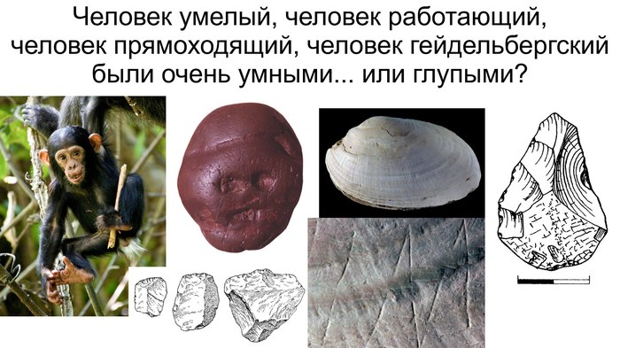 Получается, что они были умные? По сравнению с шимпанзе. Но если Вы, допустим, от своего ребёнка, которому 16 лет, увидите великое достижение — царапульку на раковине, я думаю, восторга у вас это особого не вызовет. Поэтому, понятия «умные», «глупые», «умнее», «глупее» – корректны по сравнению с каждым предыдущим состоянием. Да, предки были каждый раз всё умнее. А по сравнению с последующим они были не очень. Но с некоторого момента появляются, например, игрушки, потому что можно играть палочкой, как шимпанзе, а можно играть каменным рубилом. Сделанным по технологии, но длиной 4 см и весом 17 г. Это уже достаточный уровень интеллекта, чтобы понять, что ребёнку хочется играть, и он хочет чего-то такого, и дай-ка я ему это сделаю, но при этом фантазии не хватает, чтобы это было не рубило, а что-нибудь ещё. Поэтому получается всё равно рубило. Ну вот и скажите: умные или глупые такие люди? Они были достаточно умные, чтобы жить в тех условиях, которые были вокруг. Чтобы общаться с соседями, чтобы оберегаться от конкурентов, сражаться с врагами и так далее.
