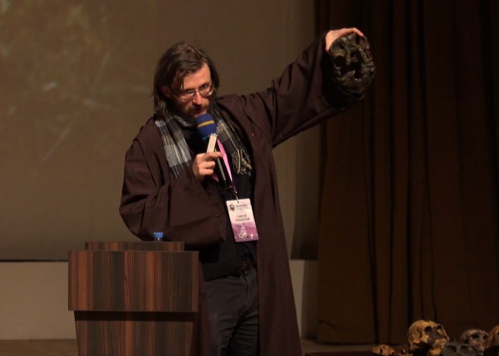 Достаточно, опять же, лишний раз посмотреть на карту мира, чтобы убедиться, что ледниковые условия, они только там где ледники. Они на севере, где людей-то и не было никогда. А бОльшая часть планеты, где жила бОльшая часть населения, это не приледниковая тундра с пещерными львами, мамонтами и носорогами. Большая часть населения планеты всегда жила в чудесных, замечательных, тропических и субтропических условиях. И большой мозг возник там, потому что эти черепа, о которых я говорил выше, – это всё тропики, тропики, тропики. Вот у этого товарища (поднимает череп Homo sapiens idaltu) голова больше, чем у меня, ему 150 тыс. лет и он из Эфиопии.