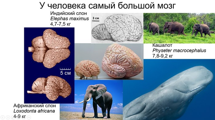 Более того, у человека не только не самый крупный мозг, но и не самый сложный по внешнему строению. Потому что могут сказать, что «зато у человека с извилинами всё хорошо». Нет, с извилинами у человека тоже не лучше всего, потому что вы можете видеть, что и у слона, и у кита, и можно было бы и дельфина сравнить, количество и сложность борозд-извилин намного выше, чем у человека. Конечно, сразу возникает аргумент, что у человека масса тела не слоновья. Всё таки человек не весит 5 тонн и не такой, как кашалот. А стало быть всё дело в относительном размере мозга, нельзя так просто подходить и измерять — просто линейкой.