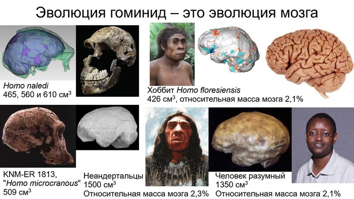 А потомки эректусов – хоббиты – убавили свой мозг в два с лишним раза. С килограмма с копейками — до 400 граммов, то есть у них произошёл регресс. Или неандертальцы, которые превосходили нас по размеру мозга. Поэтому, в общем и целом, если из космоса смотреть, то эволюция мозга это действительно рост. И если мы много-много точек нанесём, то генеральная линия будет на увеличение. Но локально есть и уменьшения, и сохранение примитивного состояния, есть превосходство по формальным параметрам, но «недогон» по каким-то ещё параметрам. Потому что функционирование мозга у неандертальцев всё таки было хуже, чем у нас. Так что мы, в среднем, конечно, всех превосходим, но памятуя о хоббитах, наледи, микрокранусах и всяких там неандертальцах, можно предположить, что в чём-то мы своим предкам в интеллекте тоже уступаем.