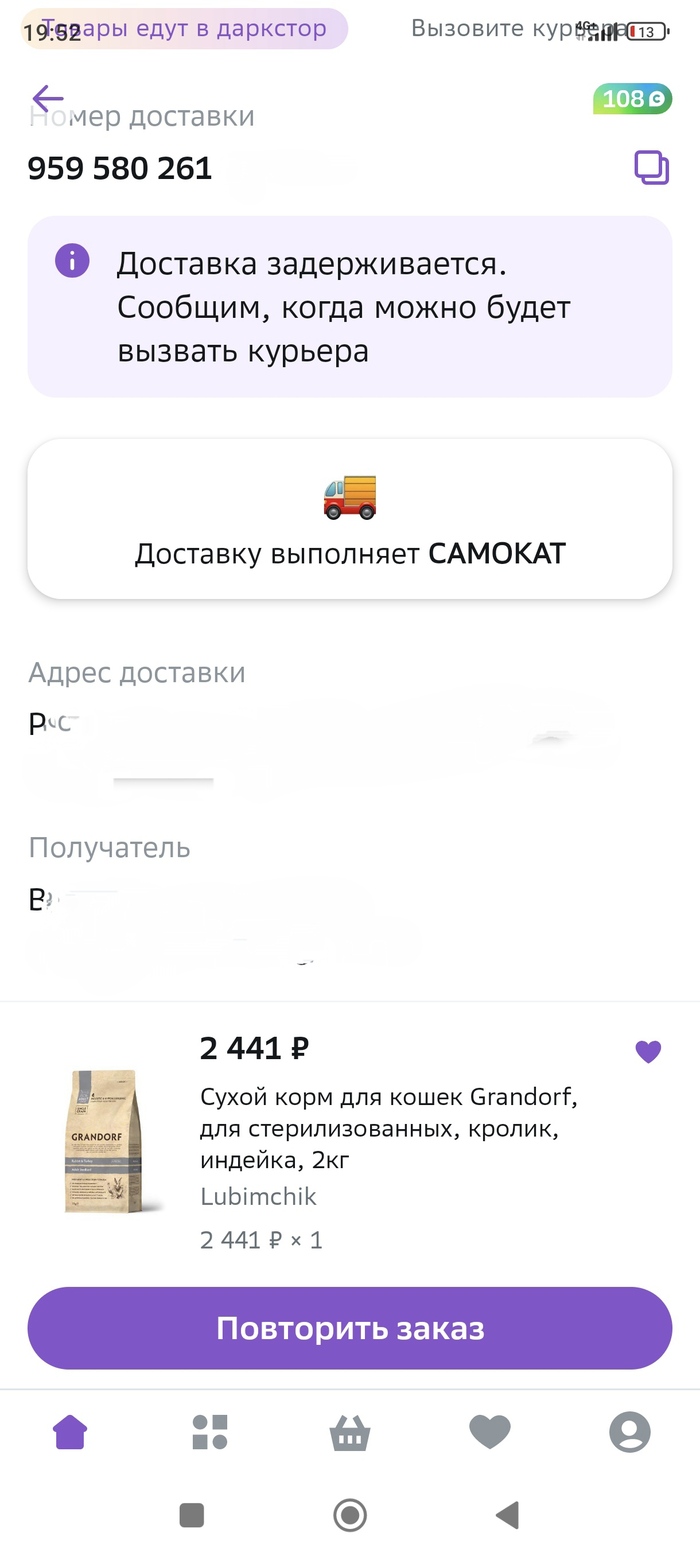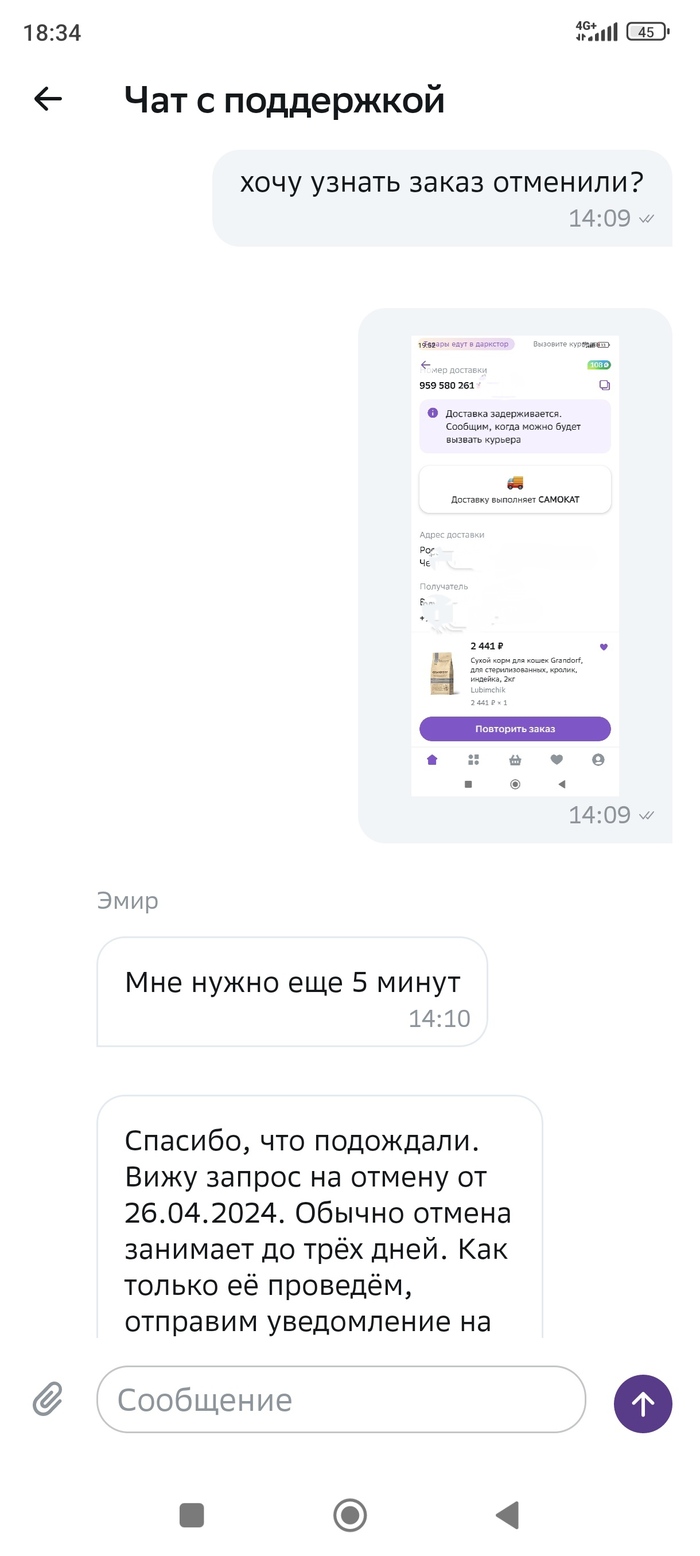 Значит история такова. 14 апреля понадобилось приобрести корм для кота Grandorf индейка с кроликом 2 кг по привлекательной цене. (На ~400 рублей дешевле чем у конкурентов). Сроки доставки были запланированы на 21-ое апреля курьером самокат по клику из Даркстора. Конечно же, 21-го балалайка)))).,статус заказа "товары едут в Даркстор"! Ладно, интересуюсь у "поддержки" мол что да как?, и почему? Клятвенно заверяют что она будет доставлена в течение 2-ух суток, но возможно и раньше... 23-го продолжает служба "поддержки" кормить завтраками! Параллельно по звонку в поддержку (в начале отвечает автомат) у "робота" по номеру заказа удалось узнать что заказ находится где-то в Марушкино на складе мегамаркета. Жду до 26-го..., и тишина. Всё по прежнему, заказ в Марушкино, в чате отписки, бла-бла-бла и так далее. Принимаю решение отменить заказ (26-ое апреля), и перезаказать новый аналогичный корм. Звоню в поддержку, отменяю заказ (в течение трёх суток не ни в коем случае позже) а как правило раньше заказ будет отменён!!!, и деньги вернуться. Сегодня 28-ое апреля. Статус заказа "товары едут в Даркстор", и издевательская фраза извините мы задерживается. Заказ не отменён. Пишу, почему заказ не отменён? Ответ меня чуть не подкасил)), мы не смогли отменить заказ, отменим его по новой., на это потребуется 3-4 дня?!!!! Не было бы так смешно, если бы не было так грустно. Хорошо что у кота есть запас, и он не голодал. Отвлекся от темы., так вот, присылают мне в качестве извинения промокод на 200 рублей при покупке от 1500 тысяч))))). (Да у них свои промо-коды) в свободном доступе и то по интереснее будут. Самое не приятное то, что в моменте общения, когда им пишешь, говоришь, то связь обрывается, то чат сами закрывают, и издевательская надпись, оцените качество обслуживания. И выбрать надо из 5 звезд. Конечно же одна, жаль в минус нельзя ставить. Ну а теперь финал, который просто "убить" может даже человека с устойчивой психикой. Приходит PUSH уведомления, что вид доставки изменился. Не самокат по клику, а МЕГАМАРКЕТ выполняет доставку и товары в пути!))) Вот такой он. Мегамаркет. Хочется добавить ЧТО вот так вот не надо, а надо вот так. (Из их рекламы как раз в тему). Что самокат не смог, а мы сможем. Прикладываю скрины общения со """ специалистами """ службы поддержки.. Финал истории дополню по завершению истории.