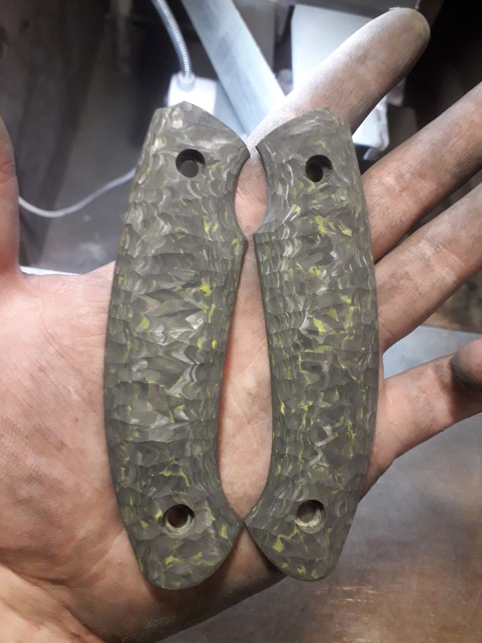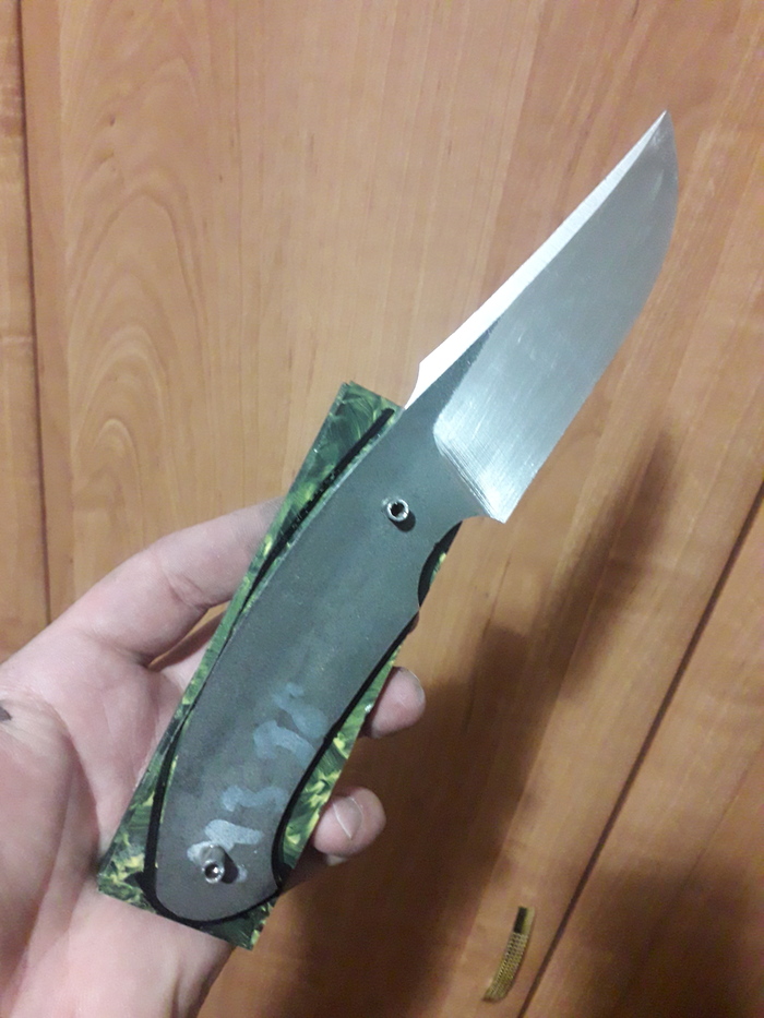Дальше стал примерять карбон, вырезать втулки и подгонять винты в плашки рукояти, попутно сделал спуски на клинке