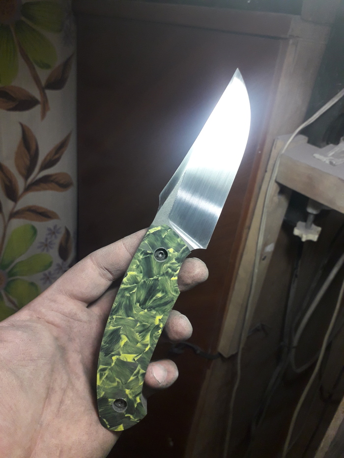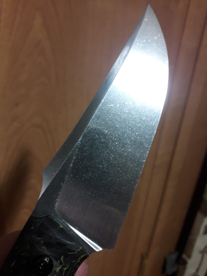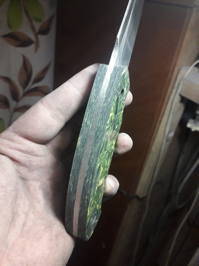 Шлифовку клинка снимать не стал, галтовку тоже. Выровнял торцы уже на собранном ноже и прошелся по ним лентой 400 грит.
