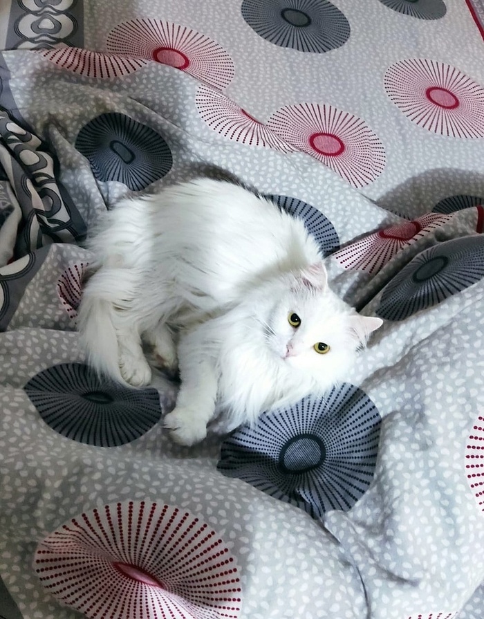 «Здравствуйте! Малыш очень нежный, мурчит, как трактор, кушает хорошо жидкий "Grandin" для кастрированных котов, сухой "Grandin" не ест пока). Вылезать и по комнате ходить тоже пока не осмелился, сидит в своём укрытии, его максимум - потянуться за едой)