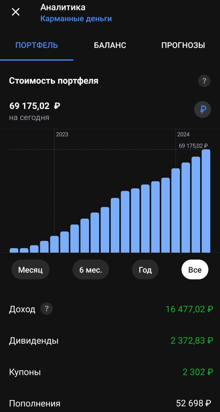 Текущая сумма - 69,1 тыс рублей. Счёт вырос на 17,6 тыс рублей. Доходность за всё время + 34 %.