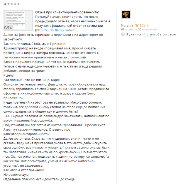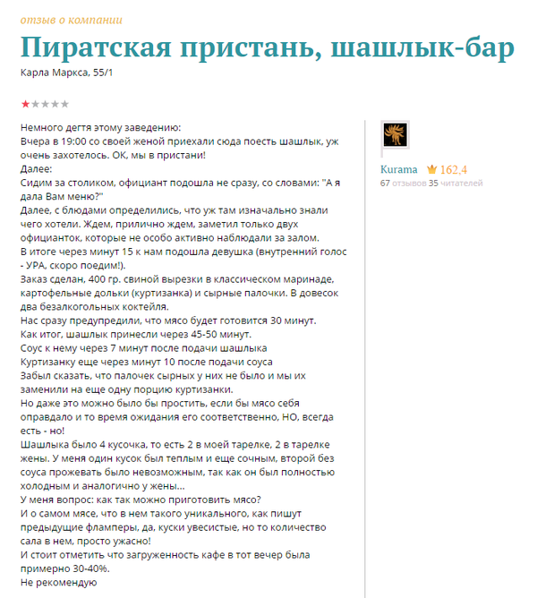 Есть такая сеть шашлык-баров "Пиратская пристань". И речь пойдет о ней, а именно о том, как я туда дважды ходил: