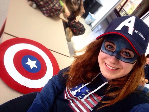 Наш спектакль был пародией на супергероев (и так как я русская, мне дали роль Капитана Америки лол). Костюмы делались примерное так: "Ребят кароче, несите из дома все что хоть отдаленно напоминает костюмы супергероев" :D Я бы выложила фотки остальных, но стремно как-то из-за прав и прочей ерунды, поэтому вот вам только я аля Кэп :D