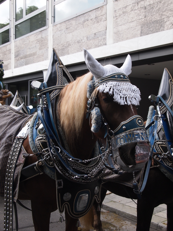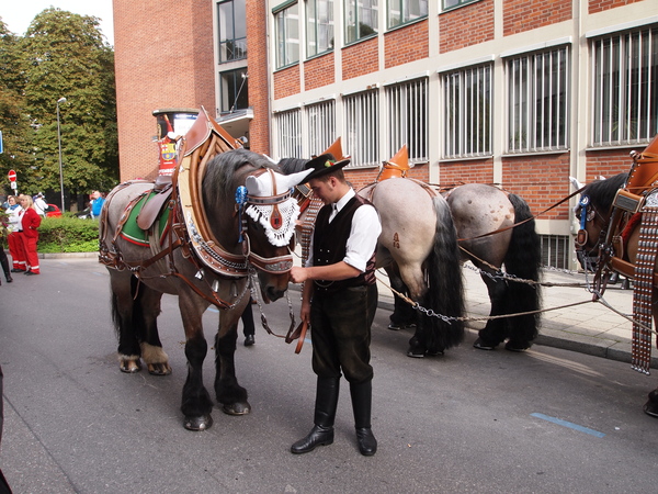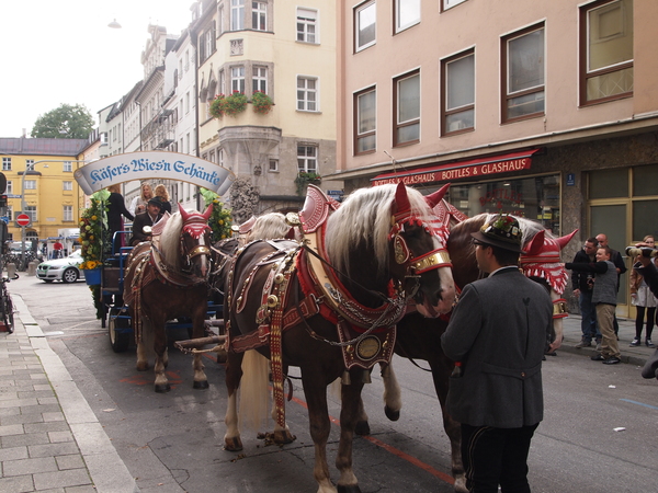 Чуть-чуть об открытии фестиваля: в 12 часов дня проводится торжественная церемония открытия бургомистром первой бочки с пивом, и только с этого момента в палатках начинают наливать. А до того проходит торжественное шествие пивоваров, которое я очень хотела посмотреть и поснимать. Еще дома я прочла один рассказ о поездке, где ребята снимали участвовавшие в шествии кареты в точке сбора, очень хотелось поступить также, чтобы избежать толкучки и иметь возможность все пощупать, посмотреть и поснимать вблизи. Именно поэтому мы ехали не до станции фестиваля, а до соседней - где-то рядом с ней все и собирались. Нам сказочно повезло - в вагон метро зашли дядечки в традиционных костюмах и с музыкальными инструментами. Когда они вышли на намеченной нами станции, мы решили, что они-то точно знают куда идти, и мы пошли за ними. И через 2 квартала они привели нас куда надо: на узеньких улочках стояли наряженные кареты, участники собирались.