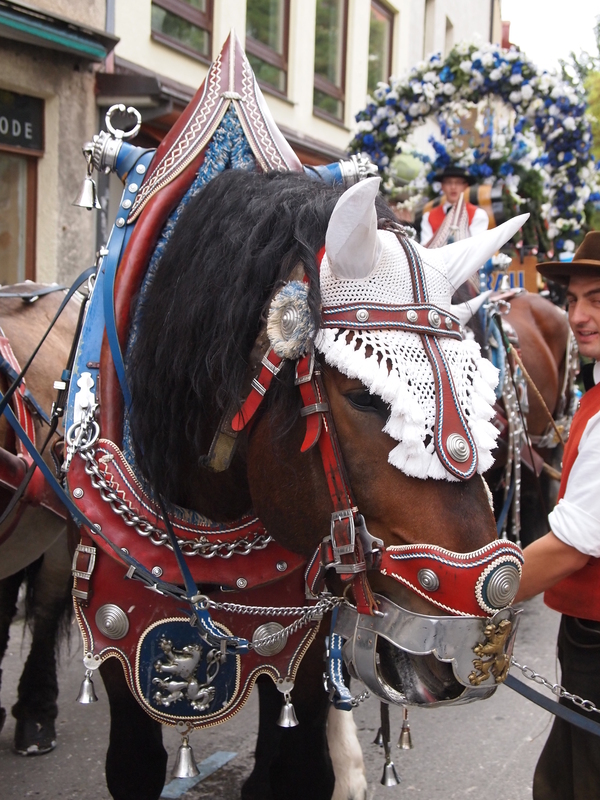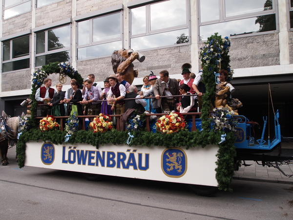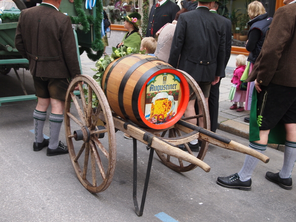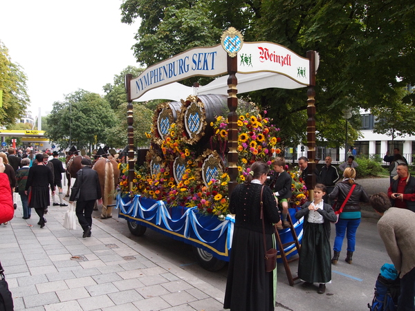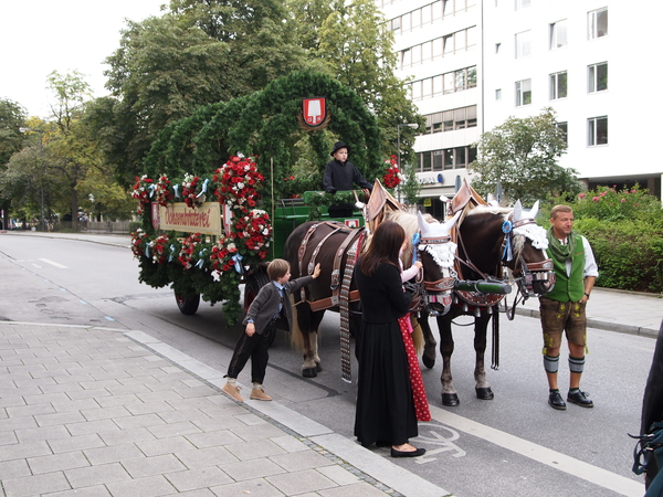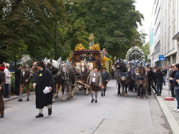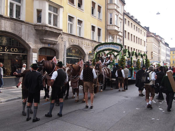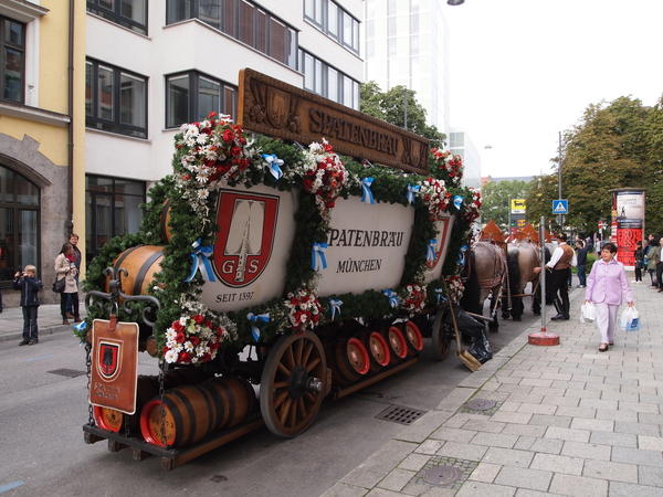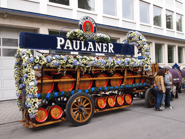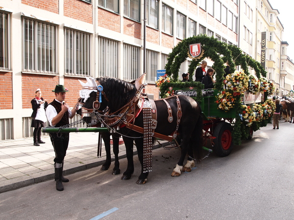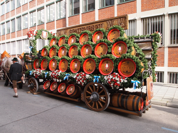 От каждой пивоварни (а они на Октоберфесте каждый год одни и те же - к участию в фестивале допускаются только местные старейшие пивоварни, создающие пиво по традиционным рецептам) шли минимум 2 повозки - одна с пивом и вторая - с самими пивоварами. Плюс повозка бургомистра и т.д. Все повозки и кони богато украшены цветами, везде гербы пивоварен, традиционные орнаменты.