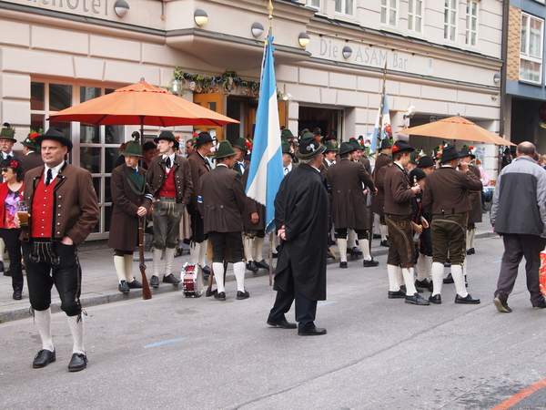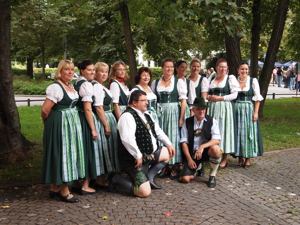 С утра я облачилась в дирндль, и мы спустились в метро. Мы позавтракали в найденном в метро Старбаксе и поехали на станцию, соседнюю с Терезиным лугом. Надо сказать, что поначалу я немного стеснялась идти по городу в таком виде, но чем ближе к центру мы подъезжали, тем больше народу в национальных костюмах заходило в вагон. Я, как девушка, не могла не заценить симпатичных парней в коричневых шортах и штанах на лямках. Хватало и солидных дядечек, чье пивное пузико свешивалось над поясом шорт. Выглядели они достаточно забавно.