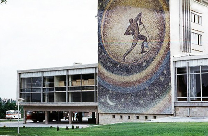 Мозаика, которая служит фронтоном, идеей, вдохновением, называется "Пахарь вселенной" авторства Аурела Давида, художника, удостоенного Государственной премии, сейчас находится в опасности.