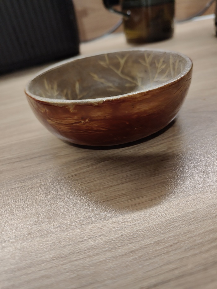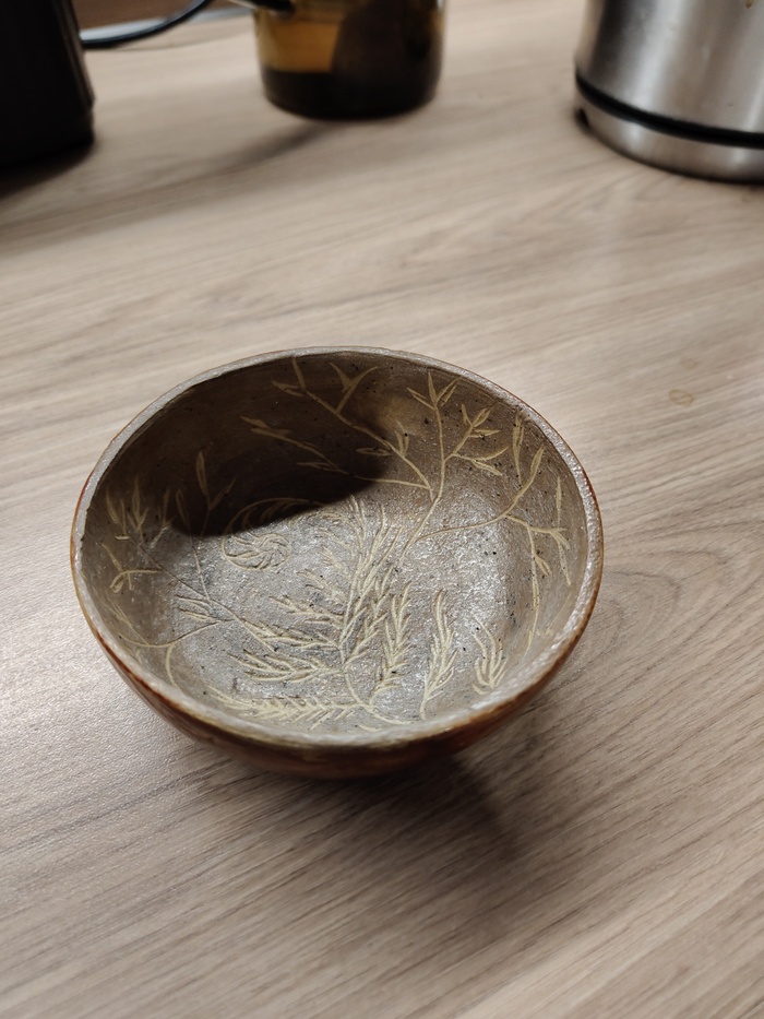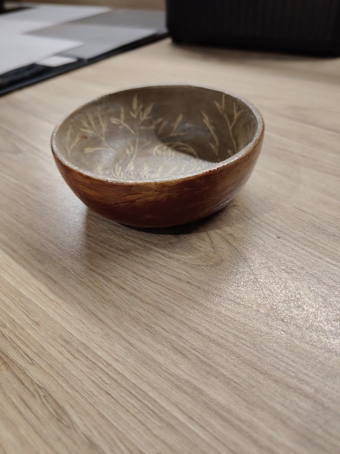 Само изделие из низкотемпературной глины, размером в диаметр порядка 10 см, высота борта около 3.5 см. Использовался оттиск мёртвых растений ))), и царапки ).