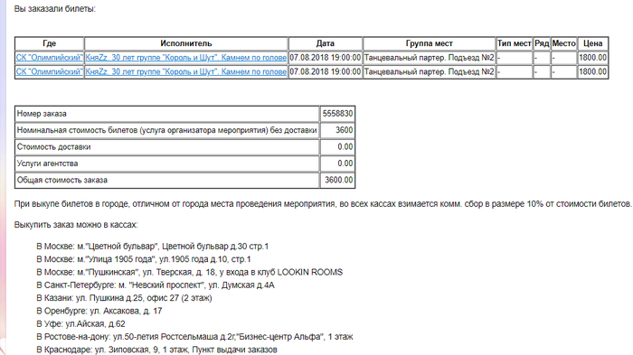 Я в ступоре, как так, меня никто не уведомил. Звоню по телефону, который был указан, девушка конторы «concert.ru» подтвердила, что бронь отменили, так как билеты стали дороже и уже нет за 1800, поэтому предложила платить уже по новой цене за 2000.