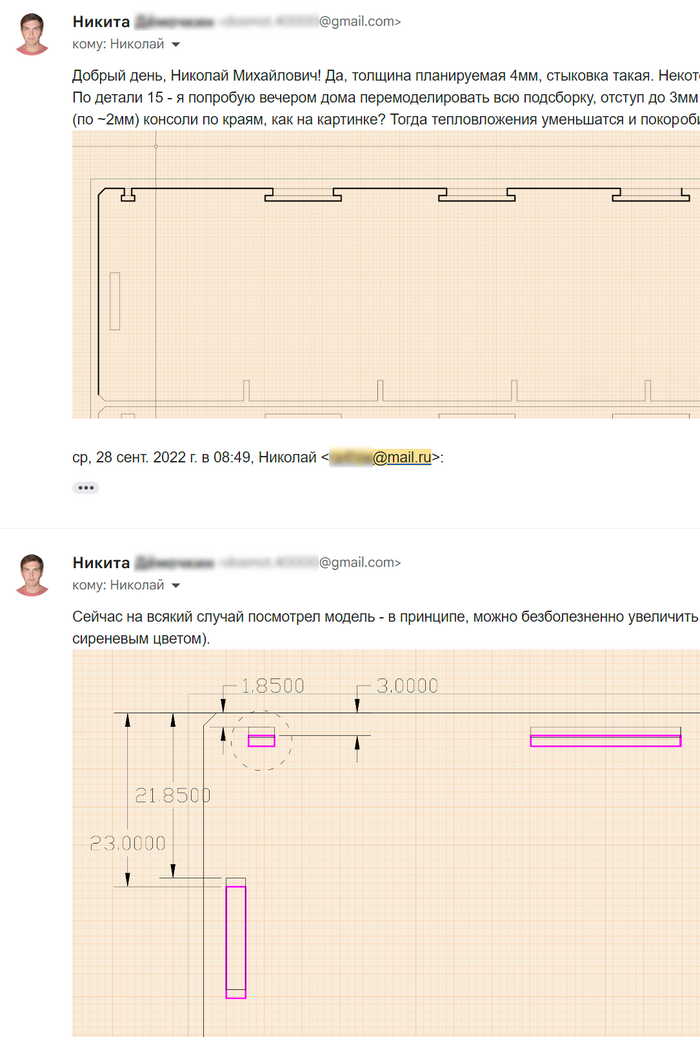 Далее следует очень долгий процесс компоновки деталей на заготовках, проверки и пересогласования, уточнения и изменения на уже готовых раскройках... Не буду описывать весь процесс, скажу лишь, что это был самый долгий этап во всём проекте, и длился он месяца три (если не считать время полного бездействия, когда я думать забыл об этом мини-проекте — а это период где-то с сентября 2021 по июль 2022). Переписка составила пару дюжин писем, и мы оба не всегда могли оперативно отвечать друг дружке по ряду причин, но, в итоге, оптимальный раскрой был готов и детали ушли в работу.