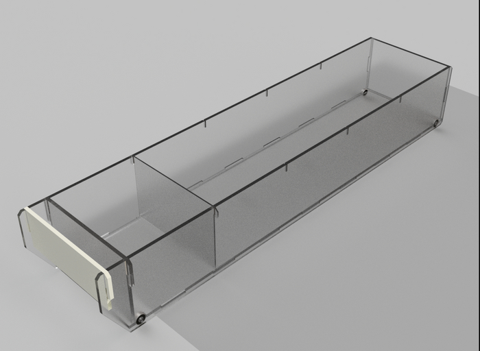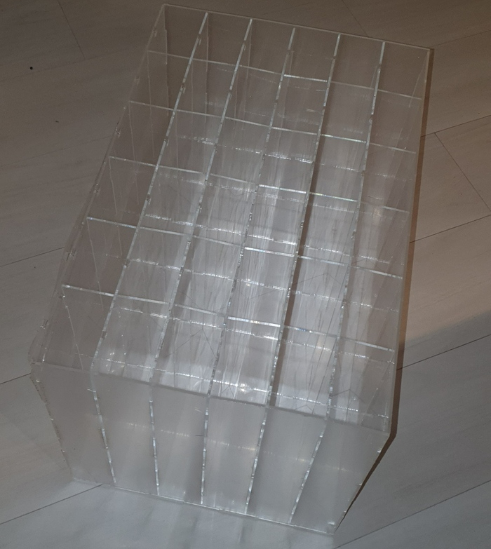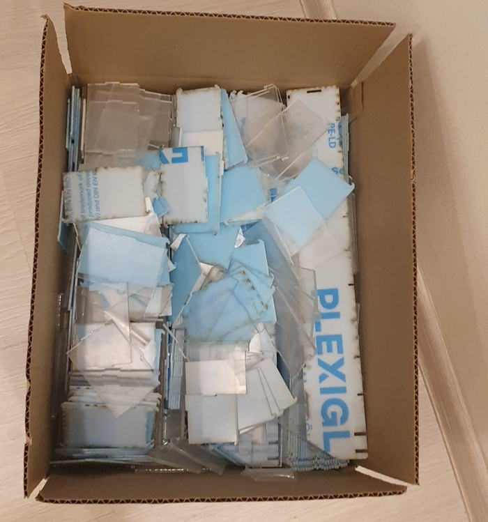 После успешного завершения и проверки модели, оставалось дождаться поездки домой, где я, наконец, смог снять размеры ячейки своего шкафчика и, решив, что толщина "толстых" деталей (сама кассетница и передние и задние стенки кассет) будет равна 3мм, а "тонких" (остальные части кассет) — 2мм, обновил модель, создал комплект раскроек для резки лазером в формате DXF и через отца вышел на его знакомого (Николай Михайлович, если вы это читаете — спасибо вам огромное!), который оказался готов нарезать мне все детали и подсказал, где купить желаемый материал (я хотел сделать всё из оргстекла, то есть полиакрилата).
