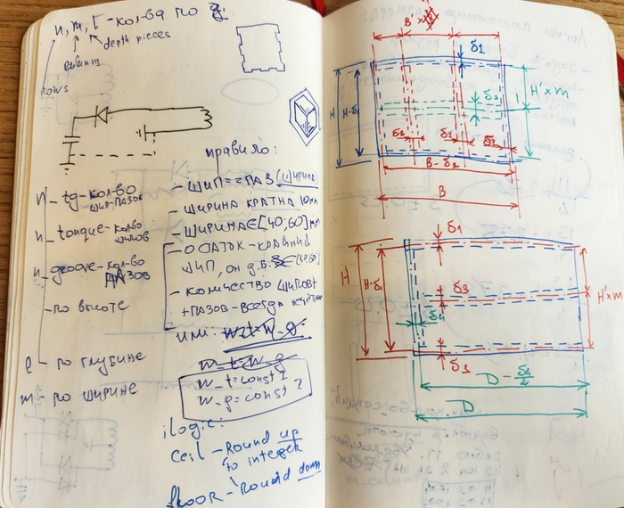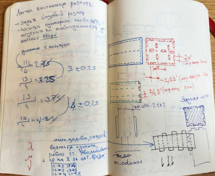 Сказано — сделано. Для начала я начеркал в скетчбуке пару набросков, чтобы лучше представить себе, как детали будут соединяться между собой и как примерно должны вычисляться их размеры: