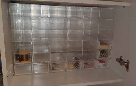 Ещё очень радует решение применять прозрачный пластик для передних панелей и ручек ящичков-кассет — благодаря этому (и группировке мелочёвки по ящикам) легко понять, что лежит в каждой секции и извлечь нужную кассету. Прозрачность междуэтажных перегородок кассетницы уже не так полезна, хотя видеть то, что лежит уровнем ниже извлечённой коробочки, тоже оказалось не вредным.