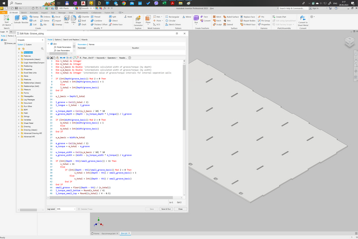 Именно последний вариант я и решил выбрать для своего мини-проекта системы хранения в шкафу. Почему не Excel, спросите вы? Во-первых, я решил делать систему из пластика по возможности на бесклеевых соединениях "в шип", которые Инвентор "из коробки" делать не умеет, но которые очень удобны для соединения относительно толстостенных листовых деталей во всякие коробочки, мне хотелось сделать размер шипов более-менее постоянным для любых размеров детали (изменялось бы их количество И размер в зависимости от заданного "базового" размера) и при этом равным между собой, в Экселе это сделать можно, но не столь изящно (если делать в лоб — будет циклическая ссылка, размер шипов зависит от их количества, которое зависит от размера). Во-вторых, и это главное — в Экселе я это делать уже умел, хотелось освоить именно iLogic.
