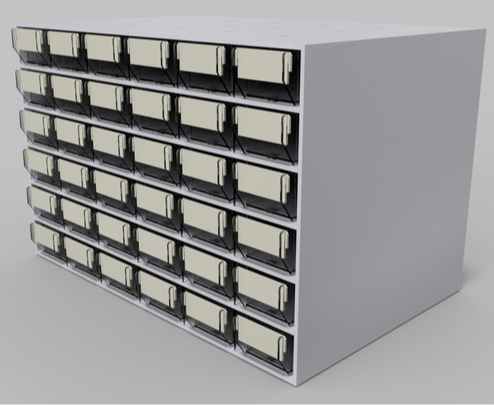 В ожидании изготовления деталей, от скуки я всегда их рендерю. На этом рендере, кстати, видна предыдущая итерация модели, где маленькие колёсики для облегчения выдвижения кассет расположены на них самих и спереди, и сзади. Позже я поменял идею и разместил только одну пару колёсиков сзади кассет, а одиночные колёсики установил на опорках, крепящихся в отверстия в днище кассетницы в передней части каждой ячейки.